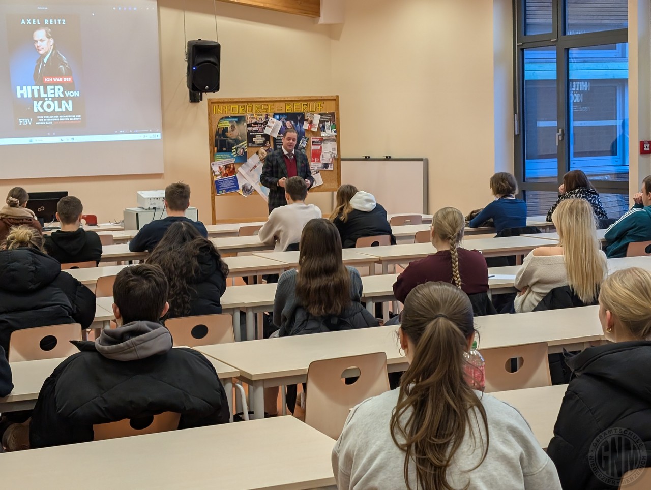 Auf Initiative der Schülerin Julia Fischermann hatte Tutor Guido Müller einen besonderen Gast an die Schule eingeladen: Axel Reitz war über zehn Jahre in der Nazi-Szene rund um Köln mehr als aktiv, bevor er in einem langen Prozess aus der Szene ausstieg und mittlerweile seit Jahren als gefragter Redner Vorträge über die Gefahren von Extremismus hält.